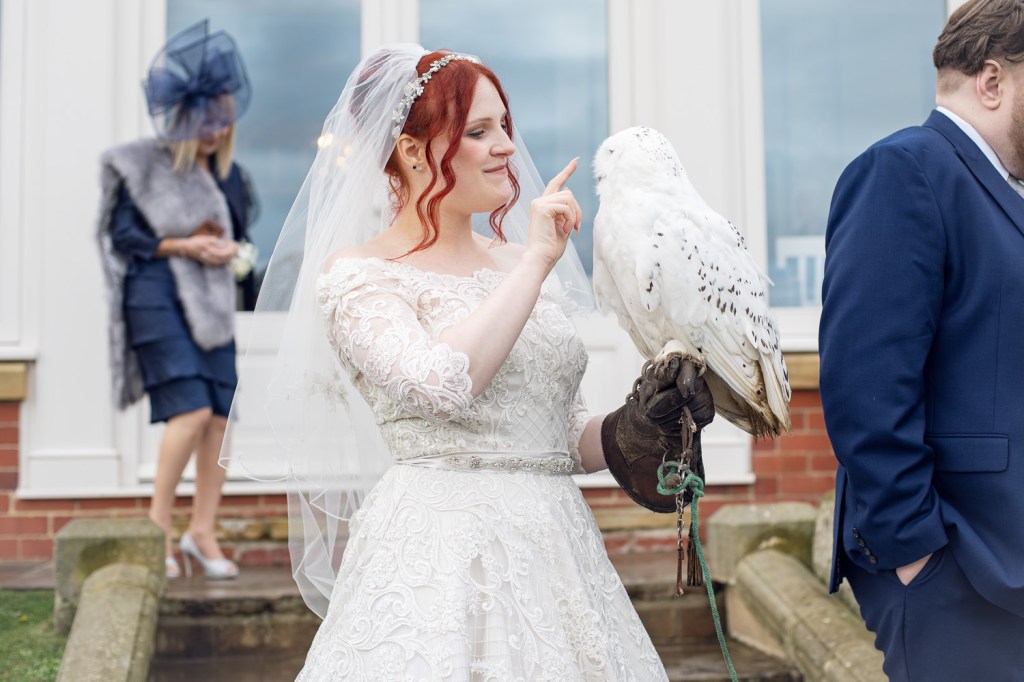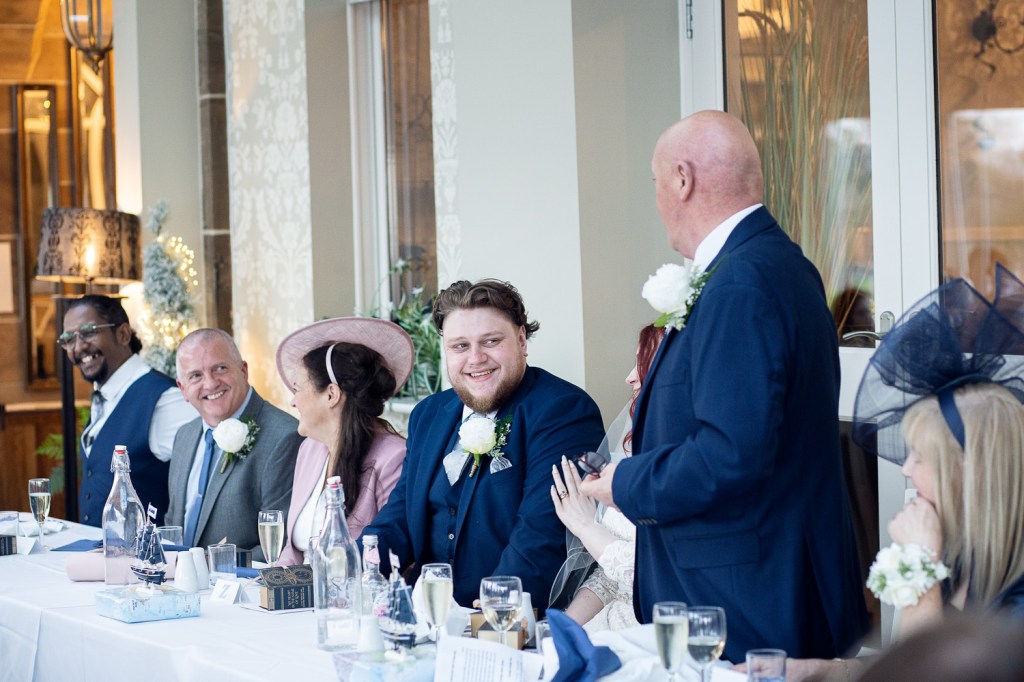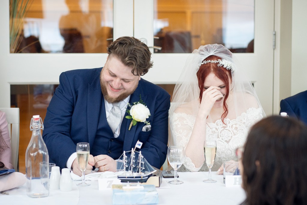 They had their ceremony in the light and spectacular orangey, with stunning views over the bay (and we were safely sheltered from the weather too). They both read out such beautiful vows to each other; and knowing them personally, it had me a little chocked up too. Guests at this wedding also included spectacular birds from North Yorkshire Moors Birds of Prey; and I think we can all agree that when you see Heather and the snowy owl together that they compliment each other perfectly. There was so much care and attention put into the table decorations as well, and I love the blues they have against the whites of the dining room.